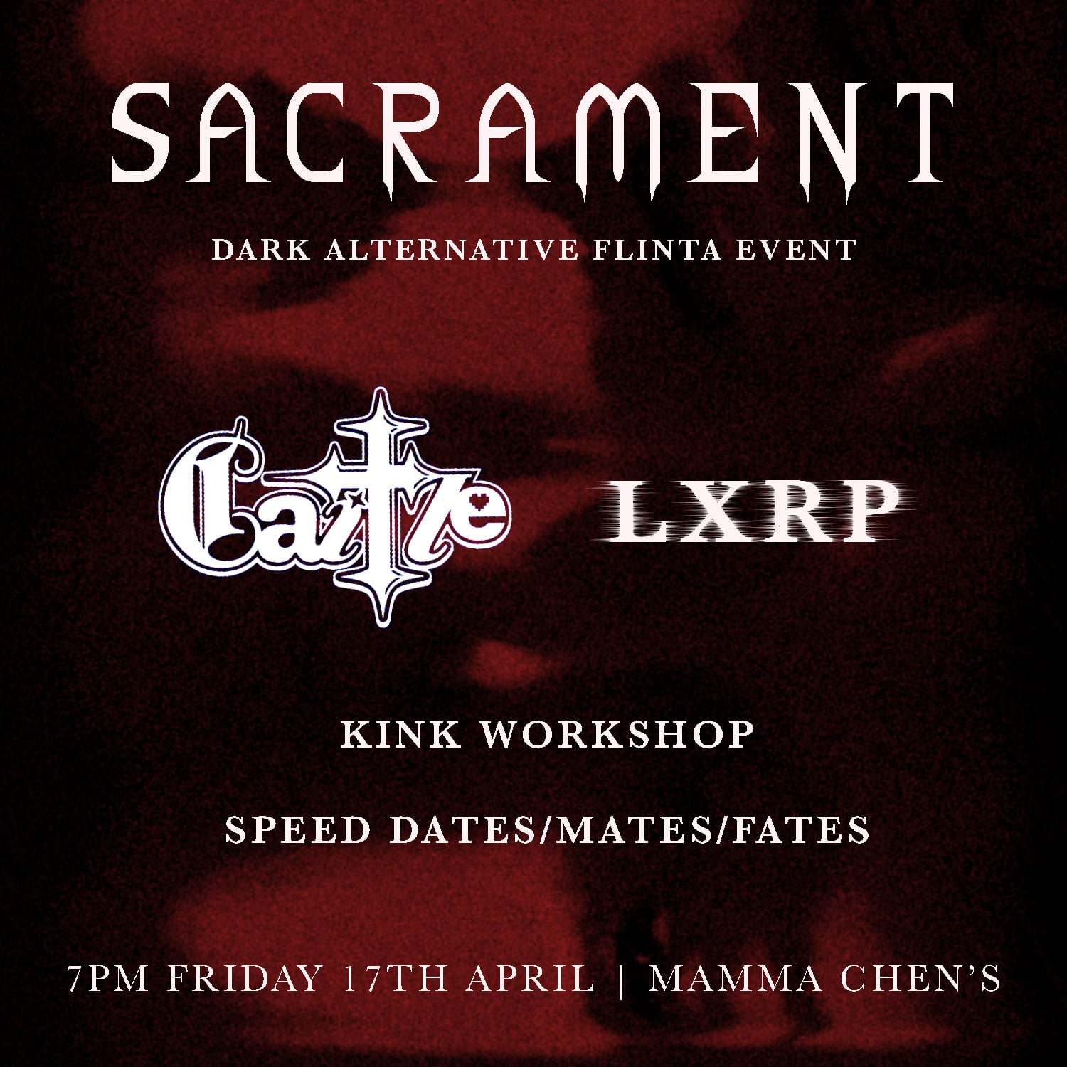 SACRAMENT is back with more bite. Let yourself descend into glorious depravity, without prying eyes or social norms. You're invited to meet like-spirits of the night through speed date/mate/fate activities, and then indulge your base desires in a beginner's kink workshop. LXRP will lead the night into a post-punk dream, fuelled by cathartic beats and irresistable hooks. Then we're joined by Caitle, fresh from their solo EP debut, to tear down the walls with glitch-goth sonic destruction. Darkness is freedom. Freaks are powerful. This is SACRAMENT. LESBIAN VAMPIRE CULT WILL PLAY A SECRET SET AT 10:30PM.